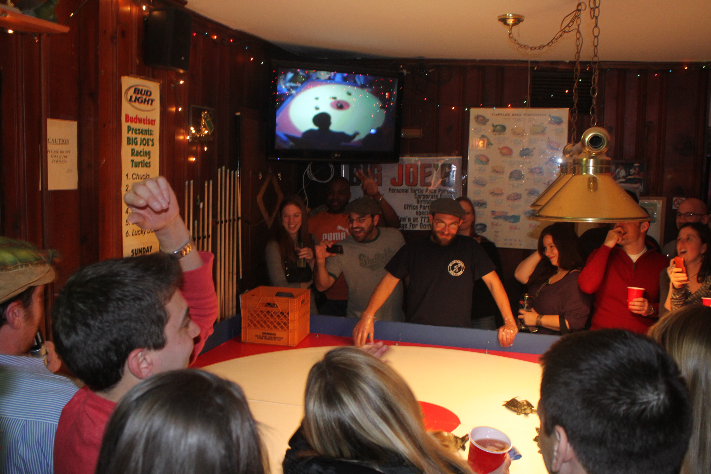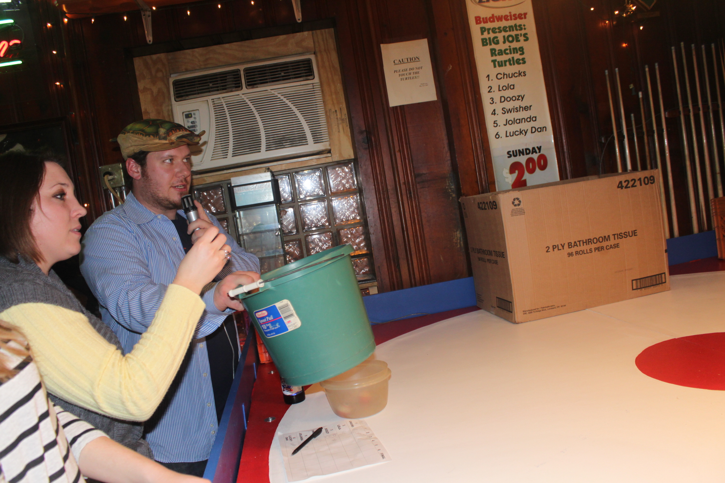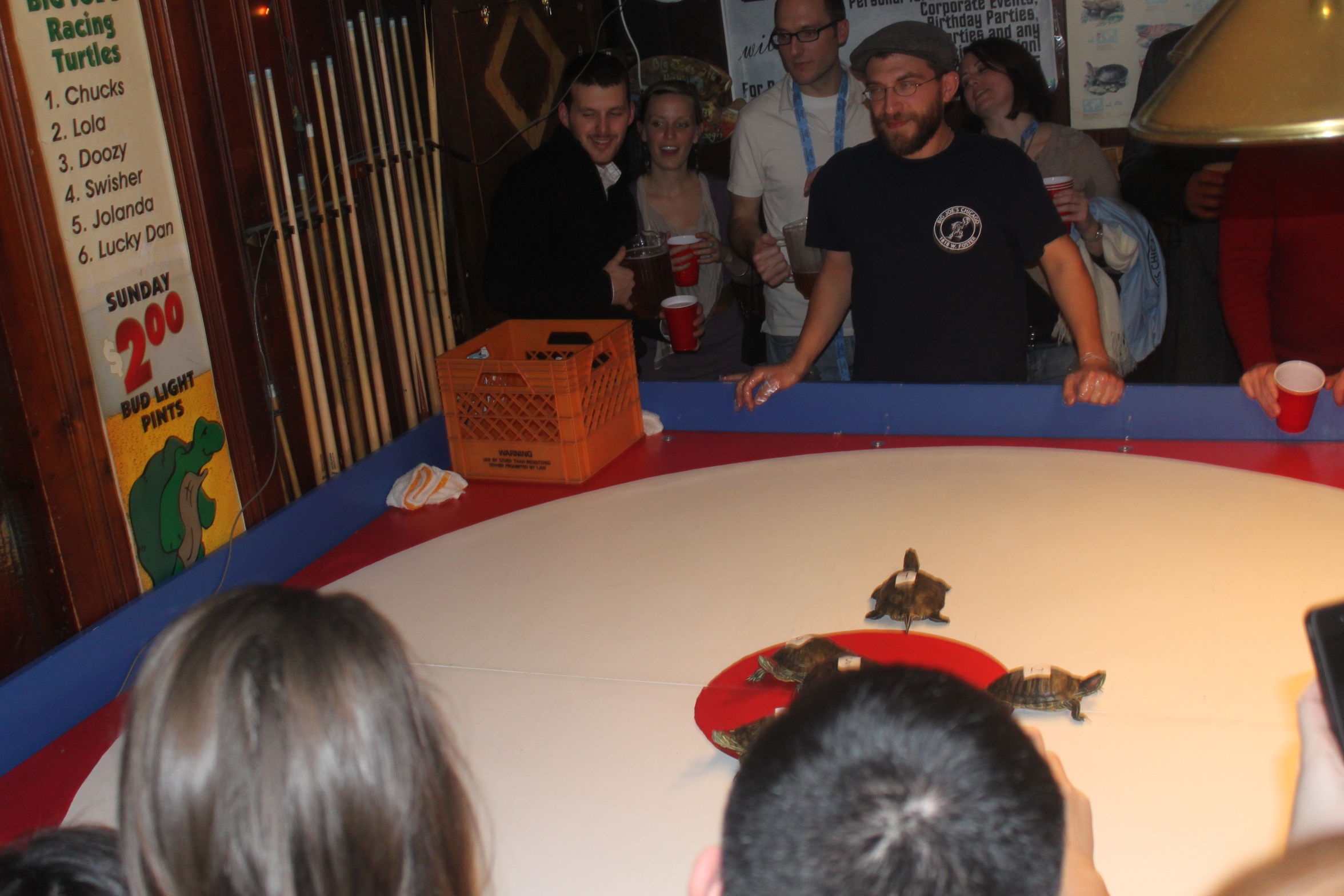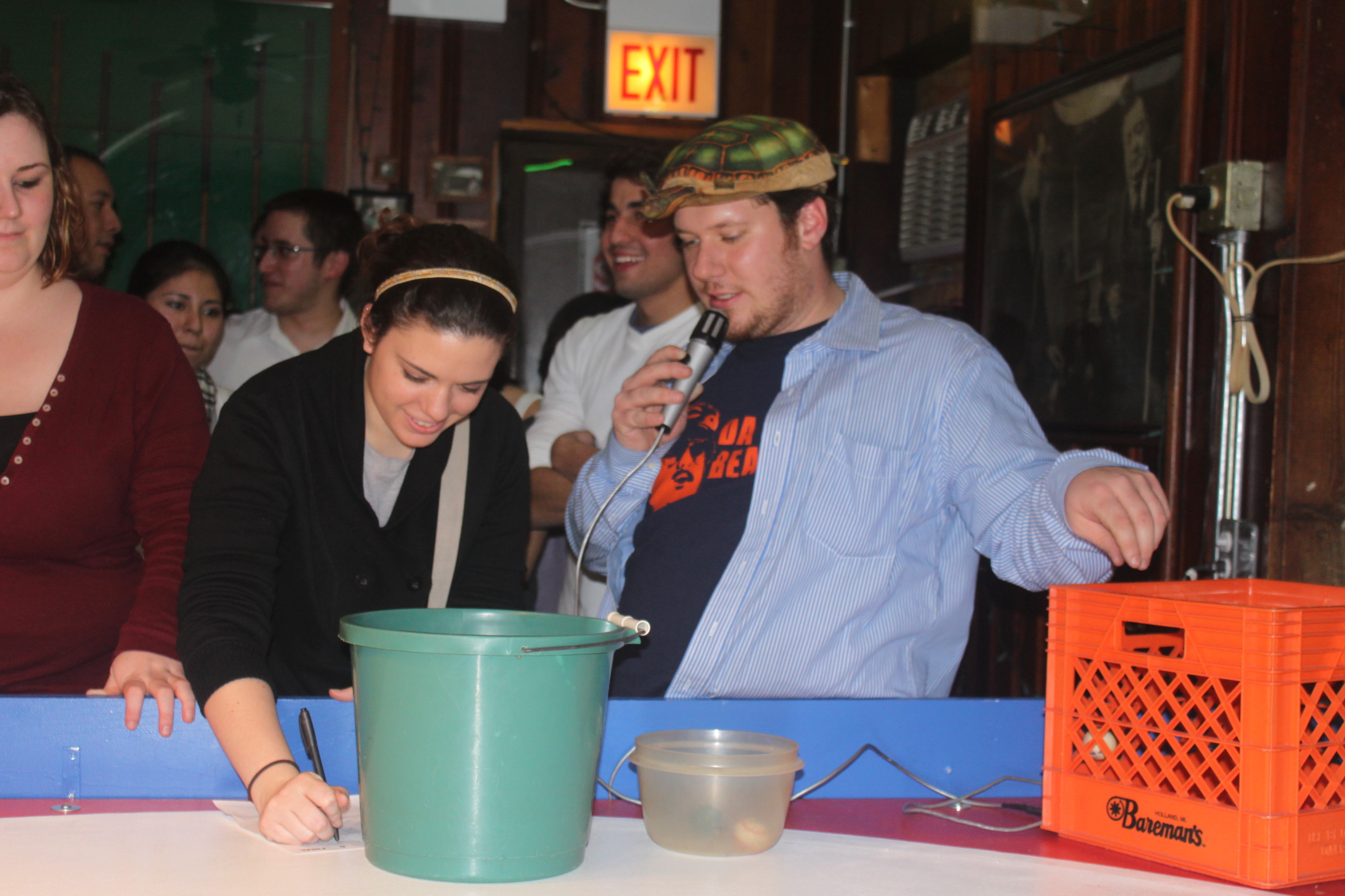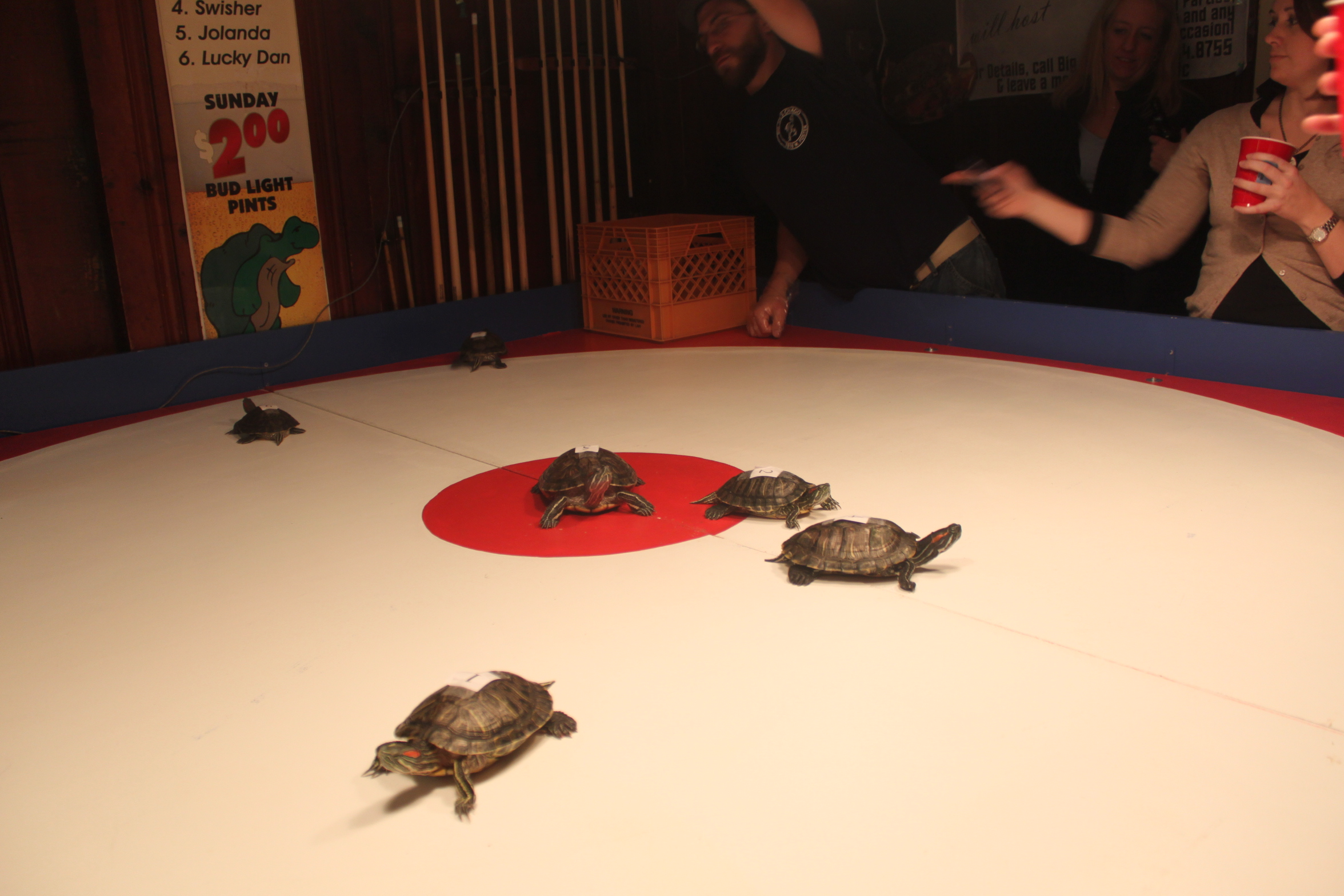 Turtles begin in the center of the ring with a cake lid covering them. The winner of the turtle race is the first turtle to get to the edge of the table. Usually the turtles will quickly move out of the orange ring (except Yolanda, who is stubborn as a mule) and then the waiting game begins! The kicker here is that the first turtle out wins you a t-shirt and gets you into the winner’s bracket for the final race. On the flip side, the last turtle out also wins you a free drink so there is still a reason to go wild for every turtle race.