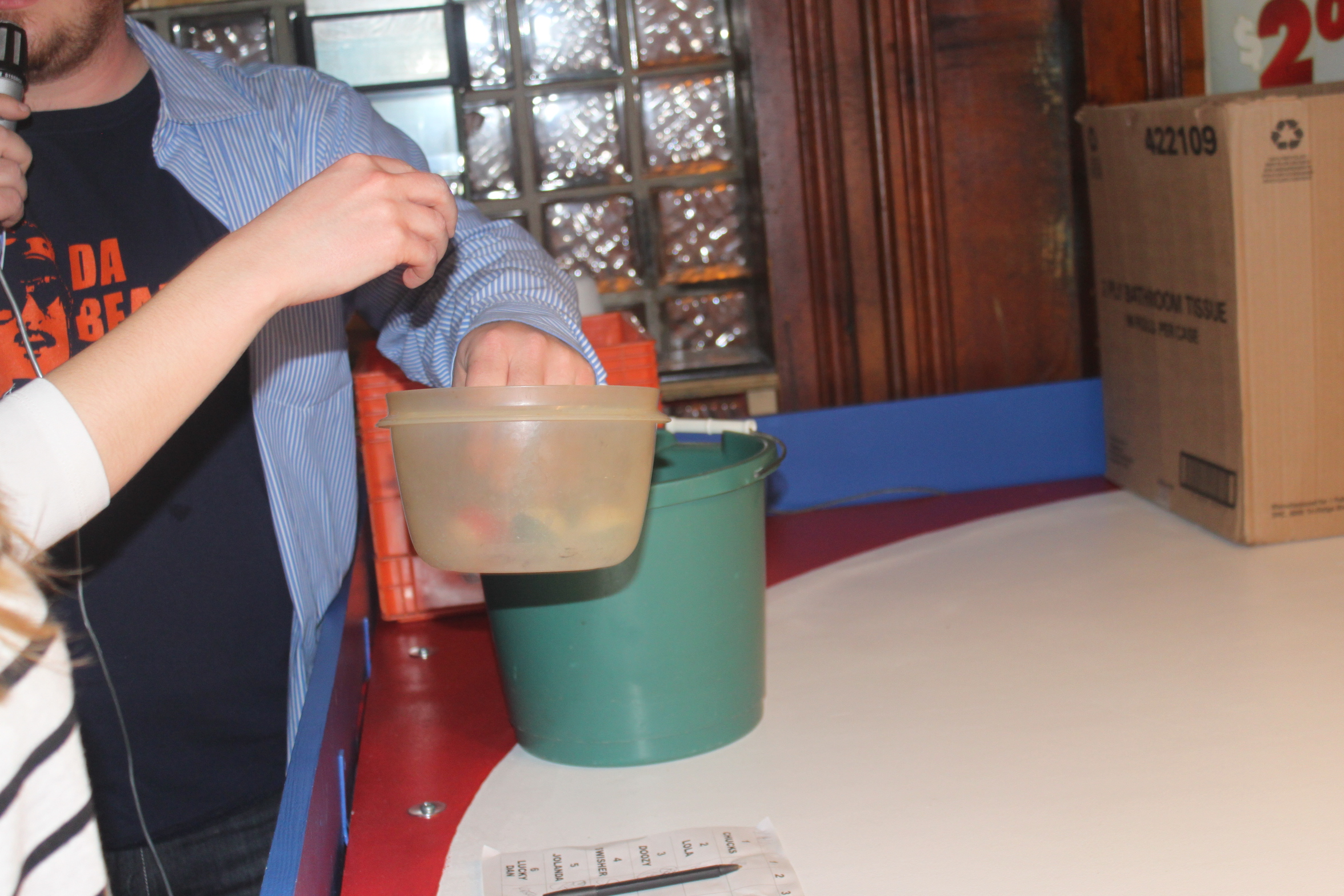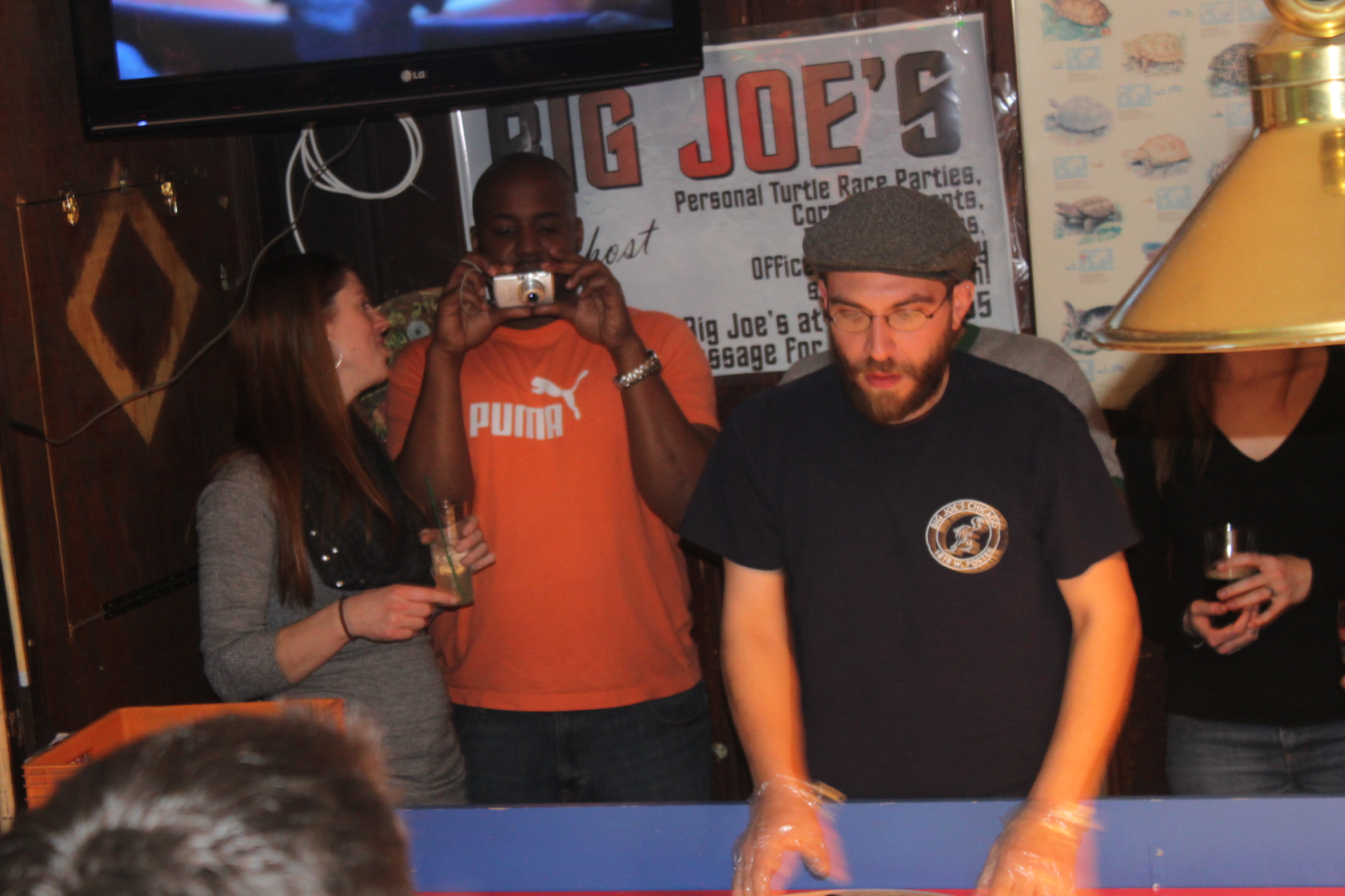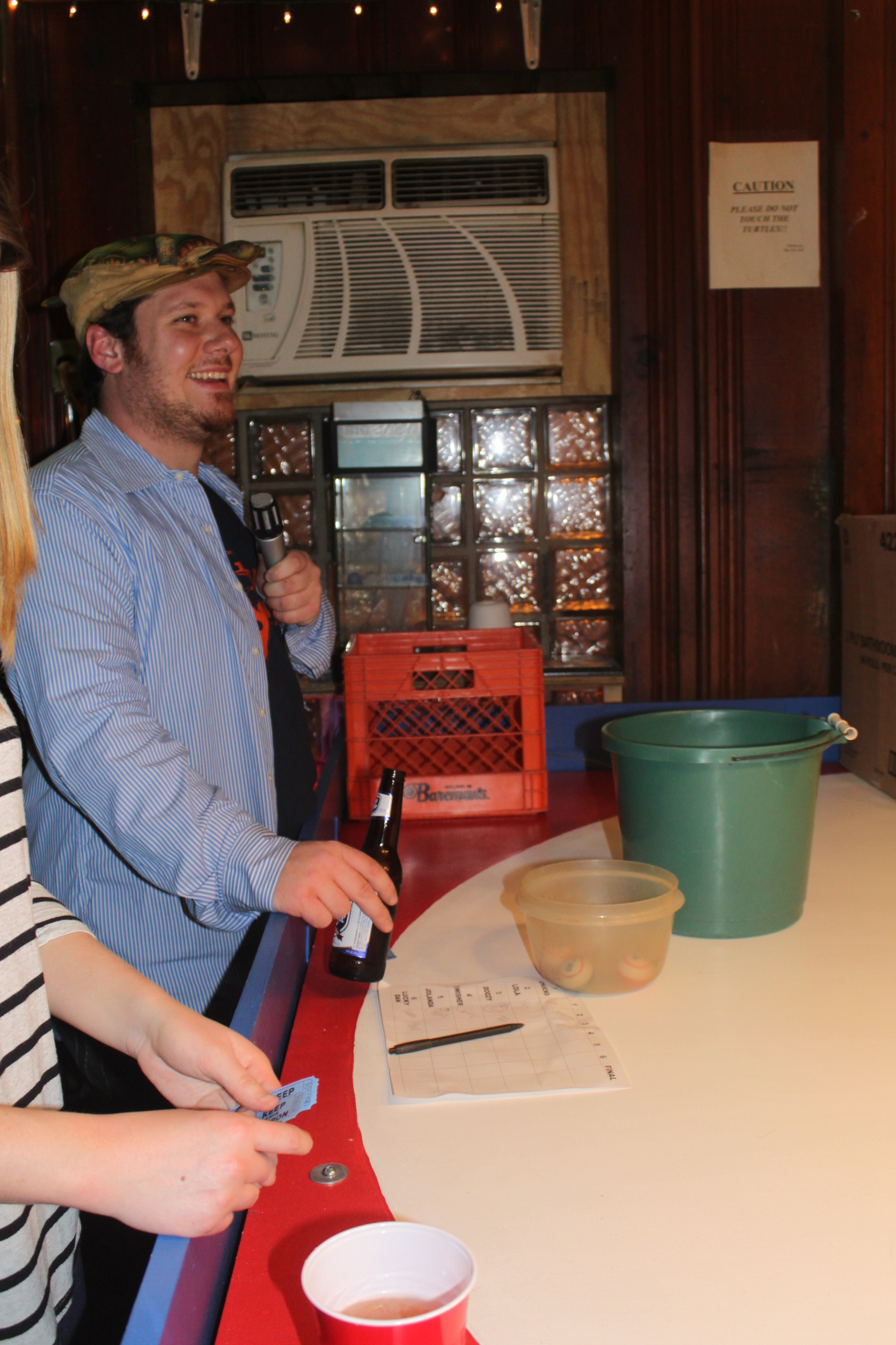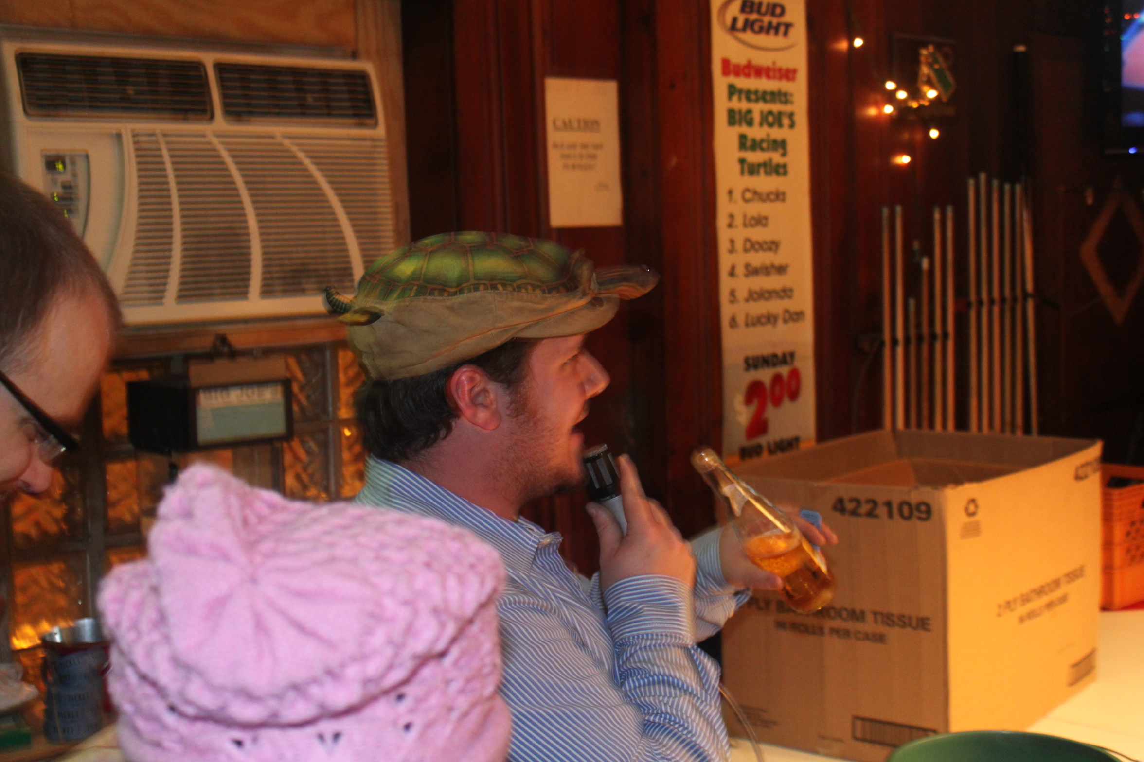 Turtles begin in the center of the ring with a cake lid covering them. The winner of the turtle race is the first turtle to get to the edge of the table. Usually the turtles will quickly move out of the orange ring (except Yolanda, who is stubborn as a mule) and then the waiting game begins! The kicker here is that the first turtle out wins you a t-shirt and gets you into the winner’s bracket for the final race. On the flip side, the last turtle out also wins you a free drink so there is still a reason to go wild for every turtle race.