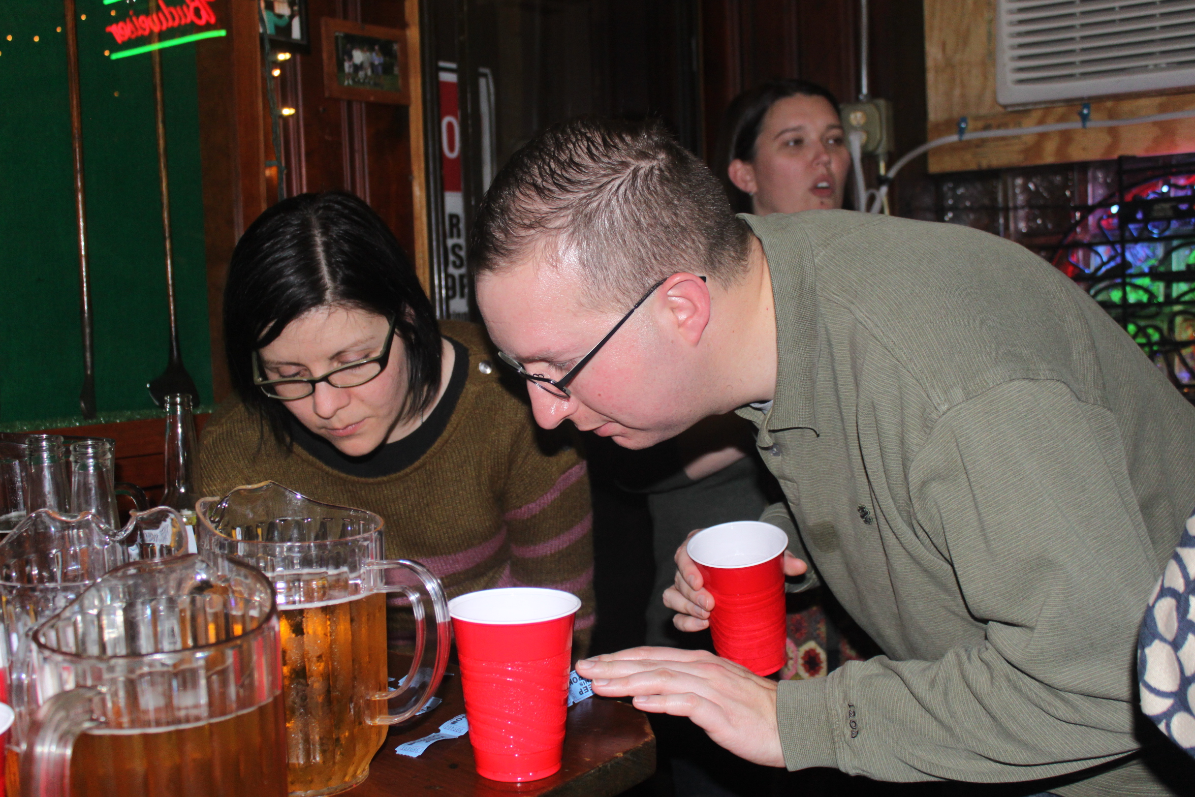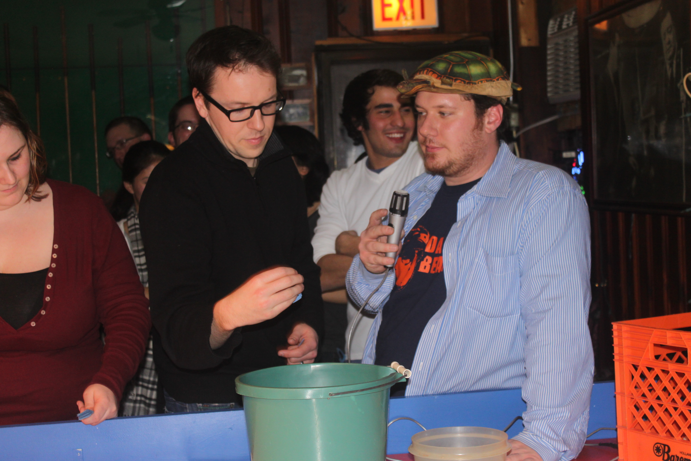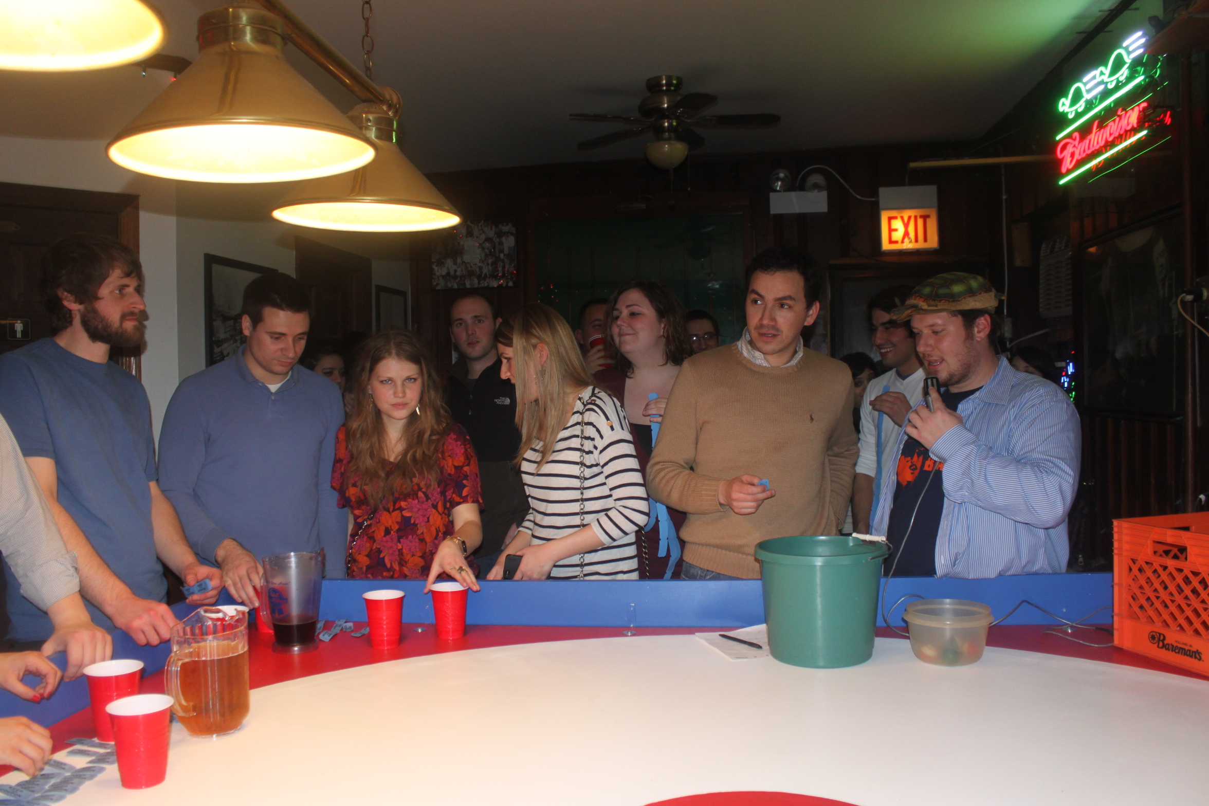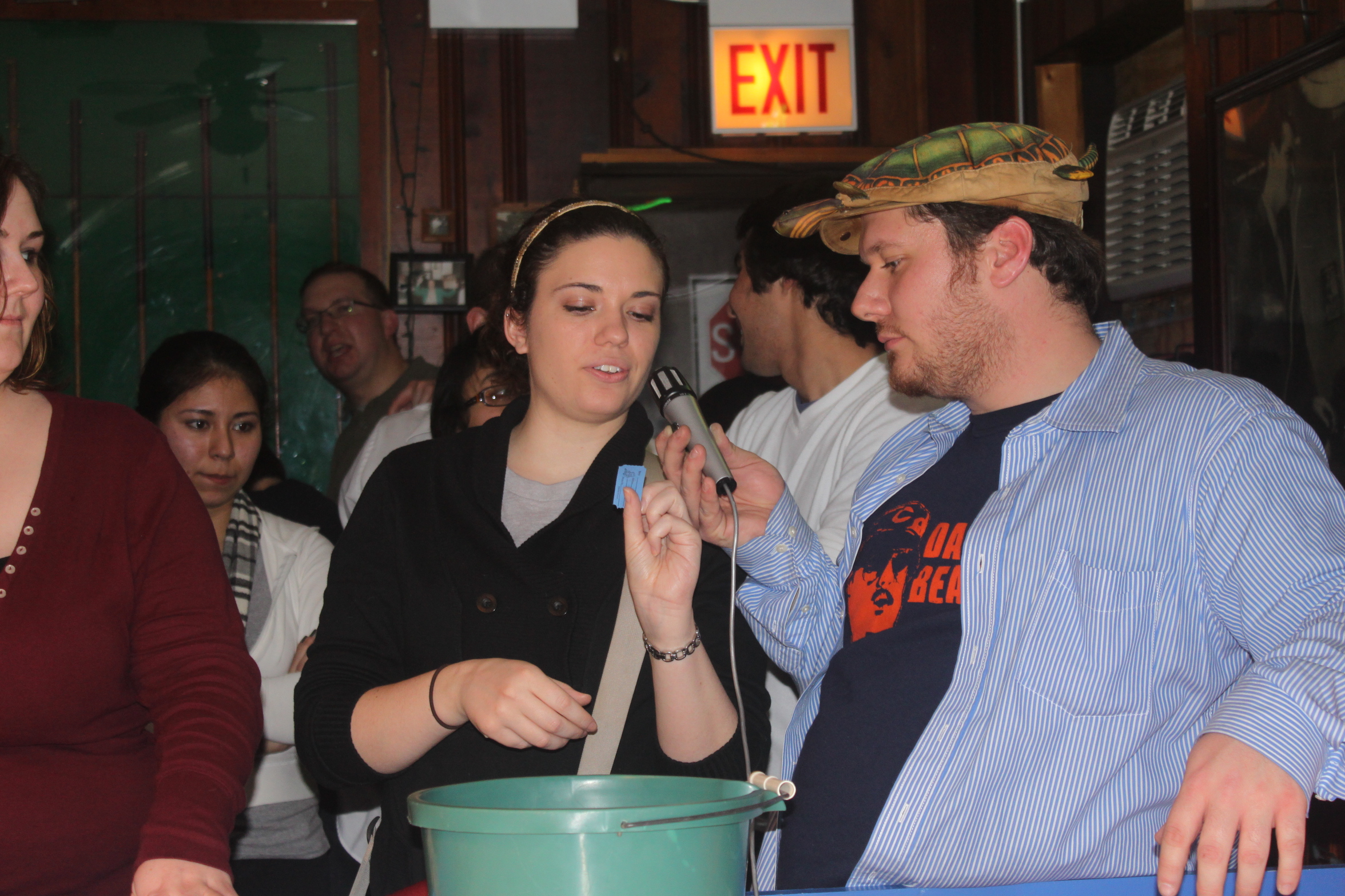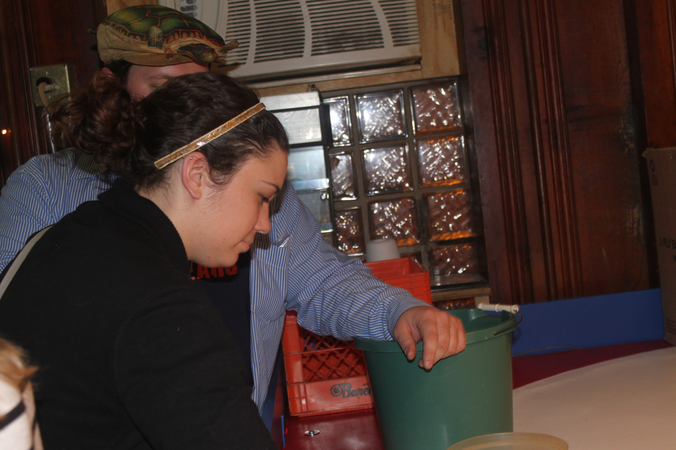 Turtles begin in the center of the ring with a cake lid covering them. The winner of the turtle race is the first turtle to get to the edge of the table. Usually the turtles will quickly move out of the orange ring (except Yolanda, who is stubborn as a mule) and then the waiting game begins! The kicker here is that the first turtle out wins you a t-shirt and gets you into the winner’s bracket for the final race. On the flip side, the last turtle out also wins you a free drink so there is still a reason to go wild for every turtle race.